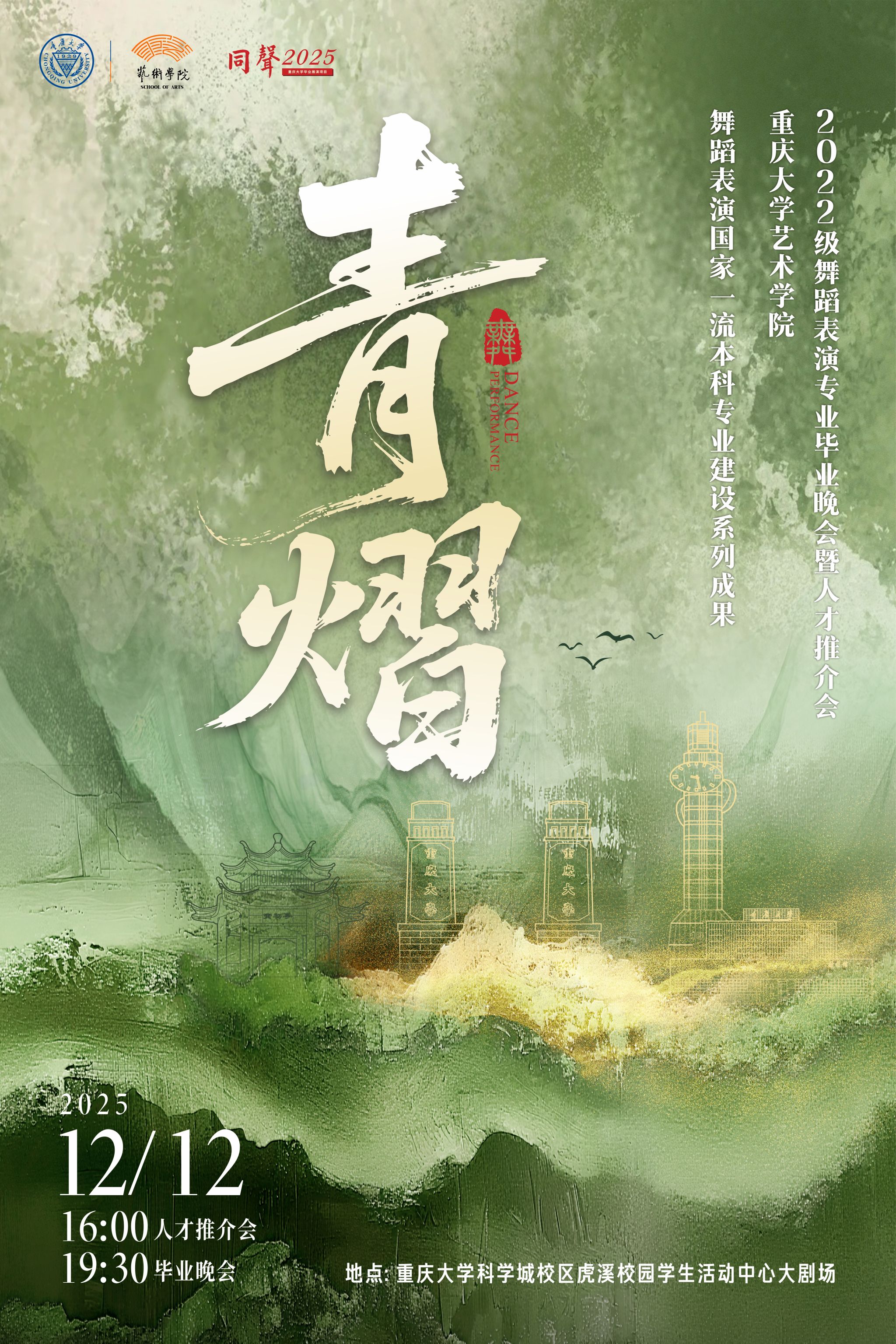 青春年华,熠熠生辉。2025年12月12日,“同声2025”蘑菇视频 毕业展演项目、“青熠”蘑菇视频 2022级舞蹈表演专业毕业晚会暨人才推介会,在虎溪校园大剧场正式拉开帷幕。此次活动是舞蹈表演国家一流本科专业建设点、重庆市一流本科课程系列成果的集中展示。蘑菇视频 党委书记蒋华林、副书记王琦、副院长夏进军,参加人才推介会的用人单位领导、嘉宾,以及校内外千余名观众到场观看演出。“青熠”毕业晚会在指导教师与2022级舞蹈表...