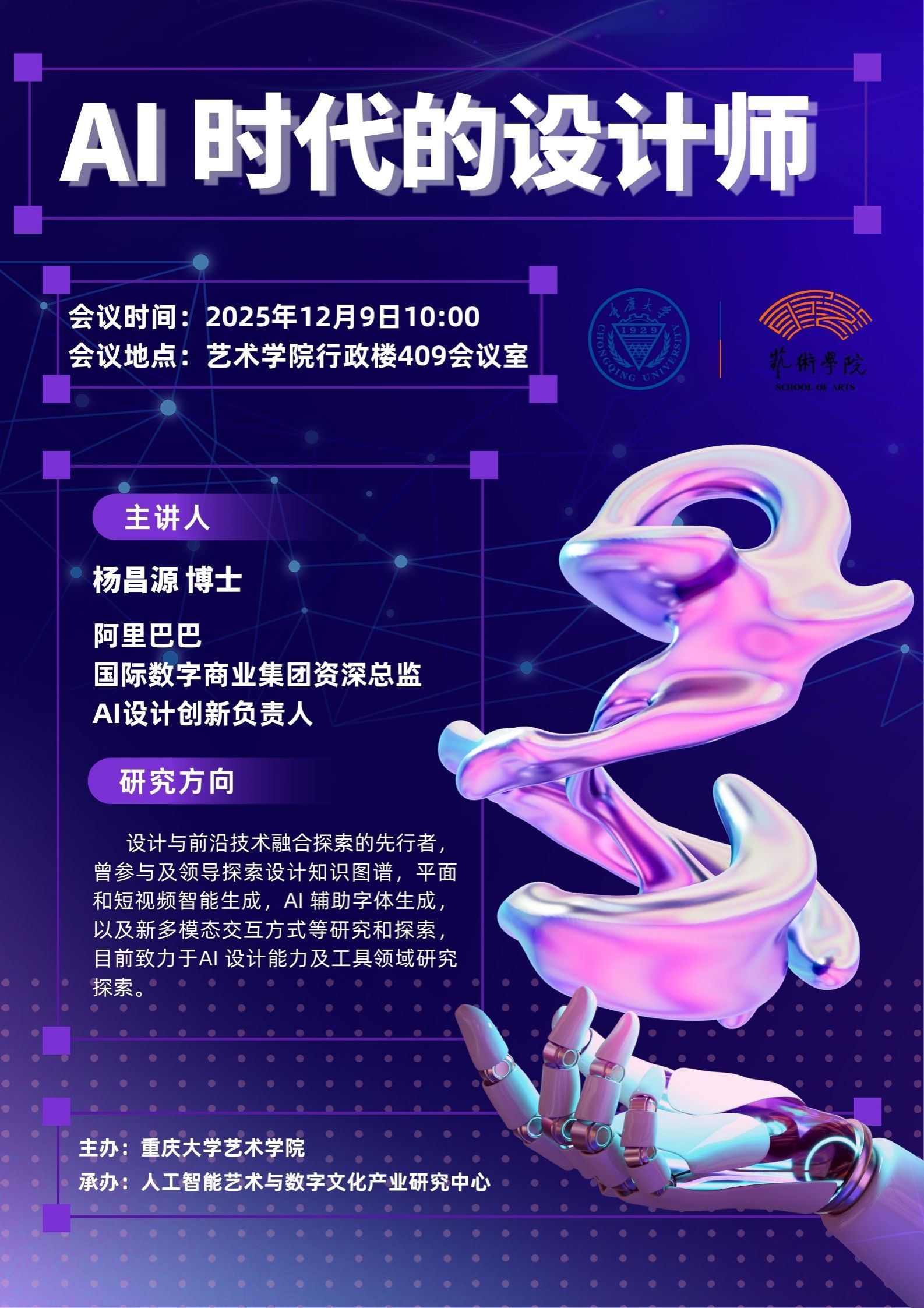 2025年12月9日上午,“AI时代的设计师”专题交流活动在蘑菇视频 办公楼第三会议室举行。本次活动特邀阿里巴巴国际数字商业集团资深总监、AI设计创新负责人杨昌源博士担任主讲嘉宾,蘑菇视频 副院长夏进军、人工智能艺术与数字文化产业研究中心主任李刚、副主任夏青以及师生代表参与了此次活动。杨昌源聚焦人工智能技术对设计行业与教育带来的深刻变革,通过专题分享与座谈交流两种形式,为学院师生搭建了高质量的对话平台。​在...