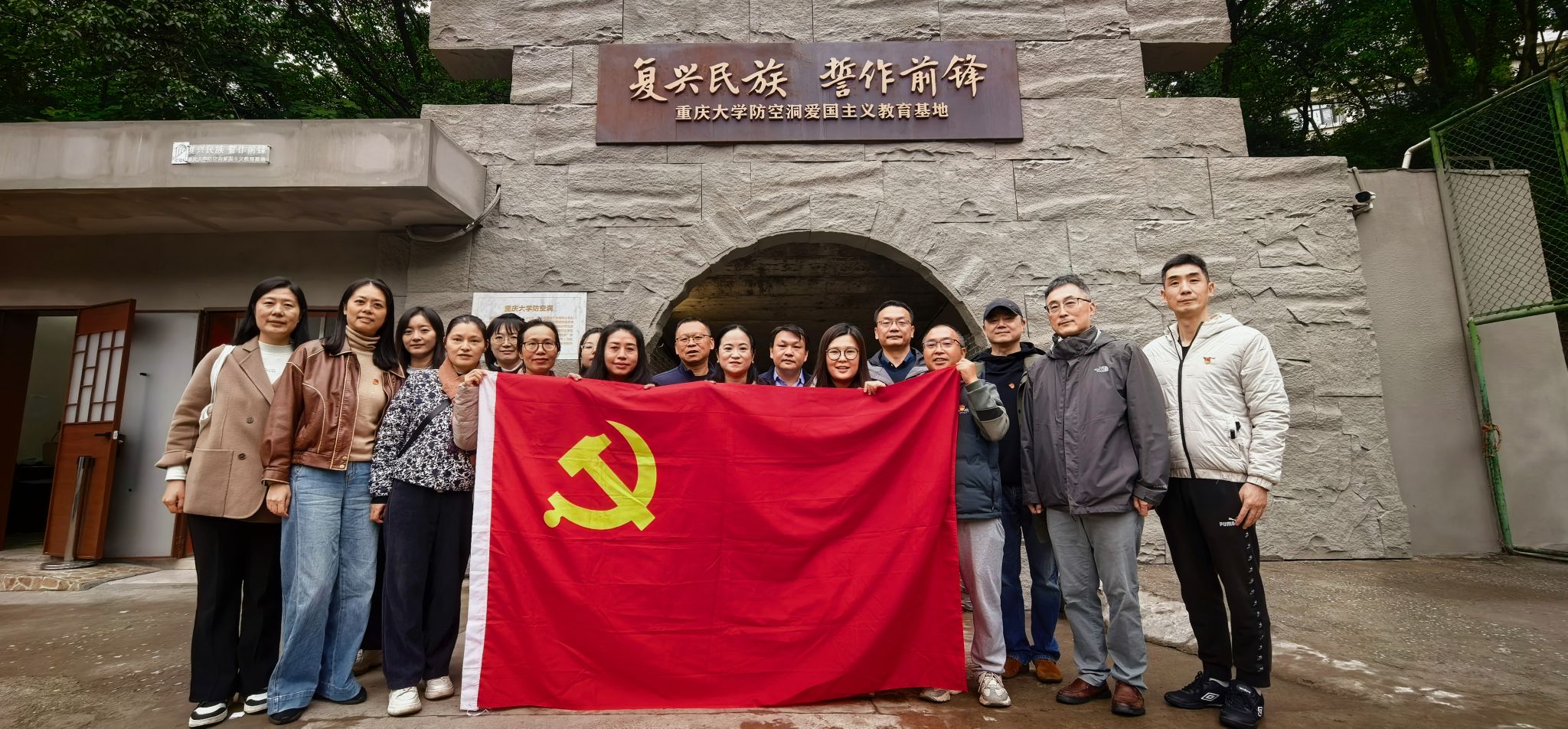 为深入学习贯彻习近平新时代中国特色社会主义思想,弘扬伟大抗战精神,增强党员教师的历史使命感与爱国主义情怀,2025年11月6日下午,蘑菇视频 行政教工党支部与设计学系教师党支部联合开展“复兴民族,誓作前锋”主题党日活动,到位于沙坪坝校区A校园的蘑菇视频 防空洞爱国主义教育基地参观学习。​活动伊始,参加活动党员在防空洞入口处合影留念,面对“复兴民族,誓作前锋”的庄严题刻,重温初心誓言,坚定理想信念。...