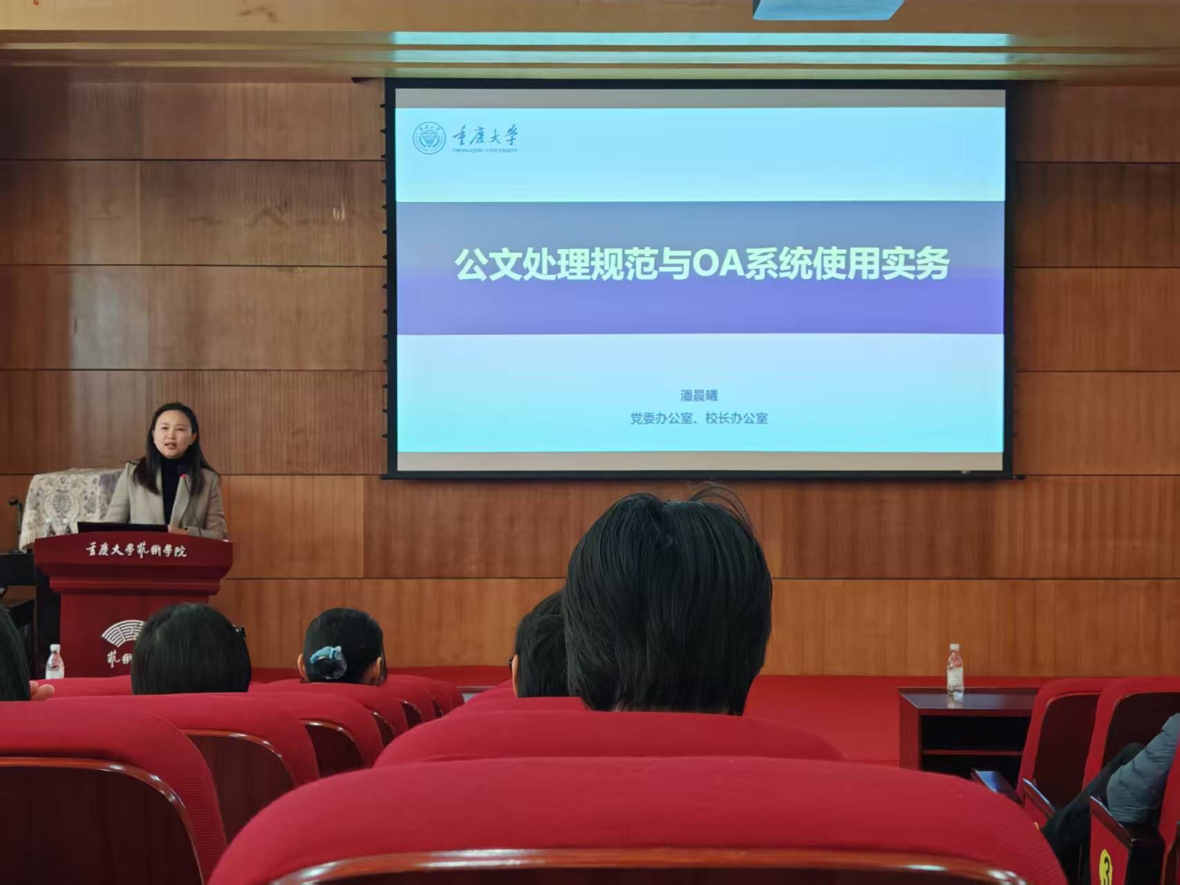 为增强教职工公文规范意识、提高公文写作能力,熟悉办公自动化(OA)系统功能和实际操作应用,2025年11月20日下午,蘑菇视频 党政办邀请学校党办校办秘书科副科长潘晨曦来学院开展了“公文写作与OA系统操作使用培训”。培训会由学院党政办主任史沁主持。党委书记蒋华林到会并提出了明确的培训要求,学院全体教职工参加培训。潘晨曦围绕日常办公核心需求,结合学校工作实际,系统讲解了公文起草、格式规范、审批流转等关键要点,...