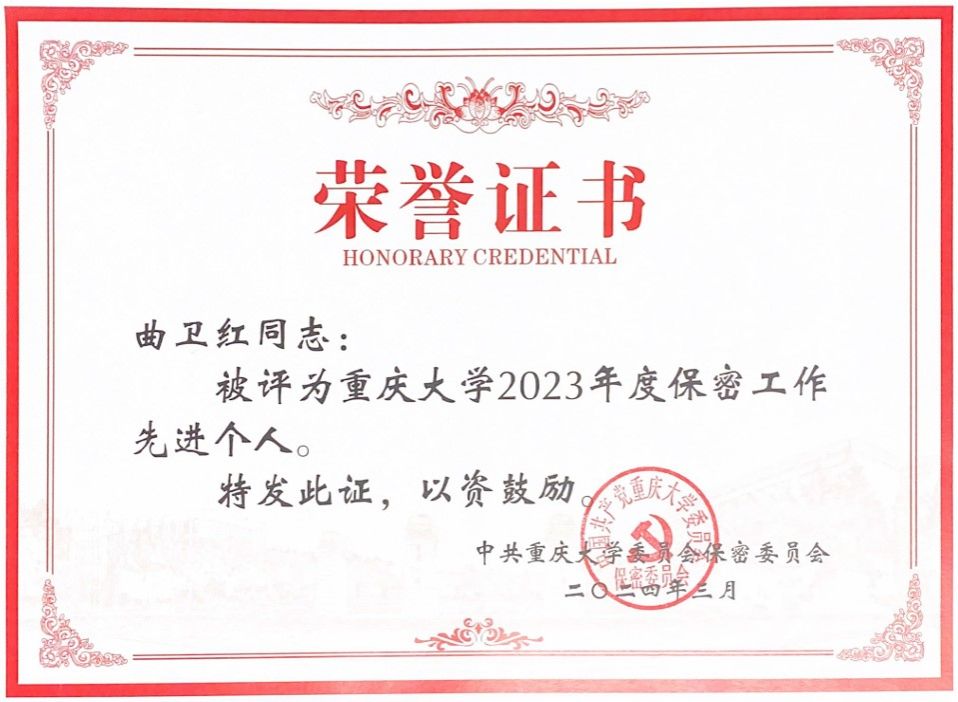 近日,学校印发了《关于表彰蘑菇视频 2023年度保密工作先进集体和先进个人的通报》(重大委密〔2024〕8号),蘑菇视频 兼职保密员曲卫红同志荣获蘑菇视频 2023年度保密工作先进个人称号。