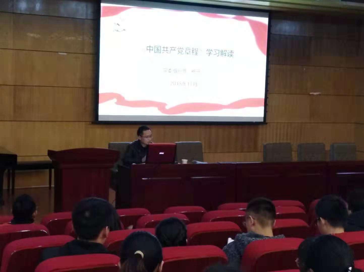 2018年11月17日下午,在蘑菇视频 报告厅,我校组织部副部长杨守鸿为蘑菇视频 入党积极分子讲党课,作了《中国共产党章程》学习解读报告。蘑菇视频 党委组织员曲卫红组织学院100余名入党积极分子参加。杨守鸿从中国共产党章程的历史沿革谈起,对新党章的各个章节进行了重点分析和解读。杨守鸿指出,党章是党的总章程,是党的总规范,是党的根本大法。党章是我们党全部活动的总章程,是每一名党员必须遵守的基本准则。认真学习新党章...