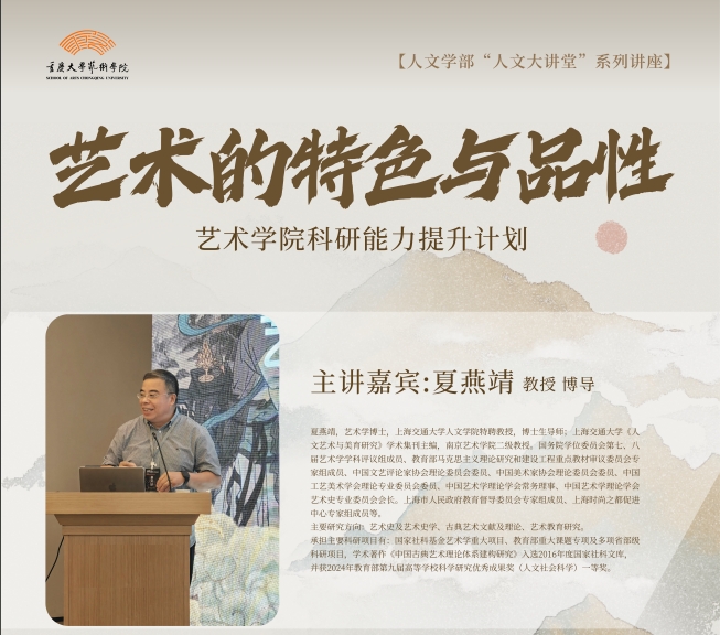 蘑菇视频 人文学部“人文大讲堂”系列讲座蘑菇视频 科研能力提升计划《艺术的特色与品性》主讲嘉宾:夏燕靖(上海交通大学人文学院特聘教授、博士生导师)主持人:张楠木(蘑菇视频 院长、教授)时间:2025年3月16日(星期日)15:00-17:30地点:蘑菇视频 虎溪校区蘑菇视频 行政楼学术报告厅(216)主办单位:蘑菇视频 人文学部蘑菇视频 主讲嘉宾简介:夏燕靖,艺术学博士,上海交通大学人文学院特聘教授,博士生导师...