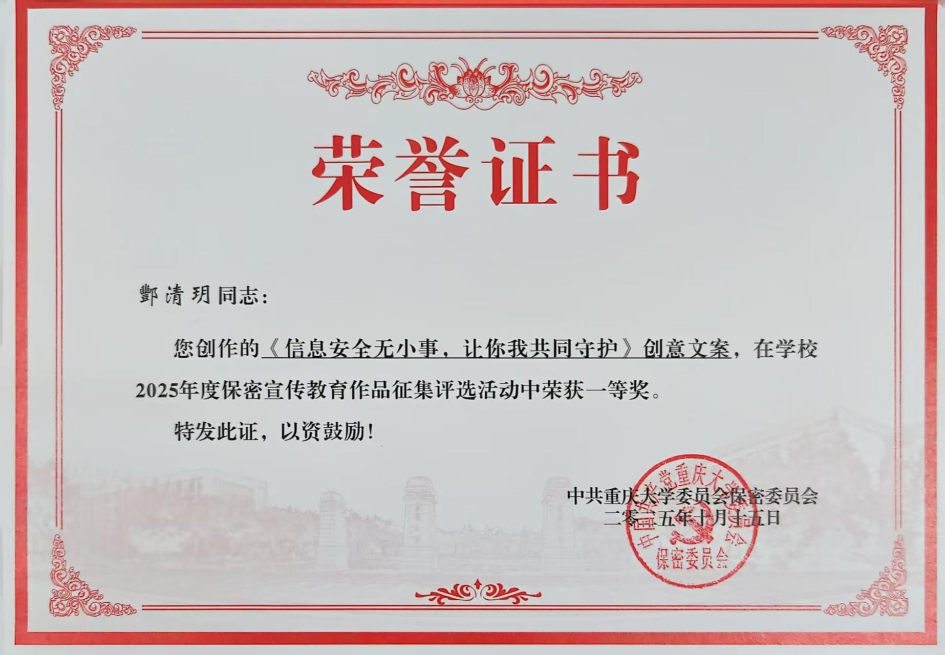 近日,蘑菇视频 保密宣传教育作品征集评选活动结果正式揭晓,蘑菇视频 学子凭借新颖的创作思路与出色的作品呈现,在众多参赛作品中脱颖而出,斩获多项荣誉,共10名同学9件作品获奖,其中一等奖1项、二等奖2项、三等奖4项、优秀奖2项,展现了学院在保密宣传教育工作中的突出成效。酆清玥同学的作品《信息安全无小事,让你我共同守护》荣获一等奖;袁节同学的作品《贯彻落实保密法,你我都是护密人》和尹兴欣同学的作品《保护国家...