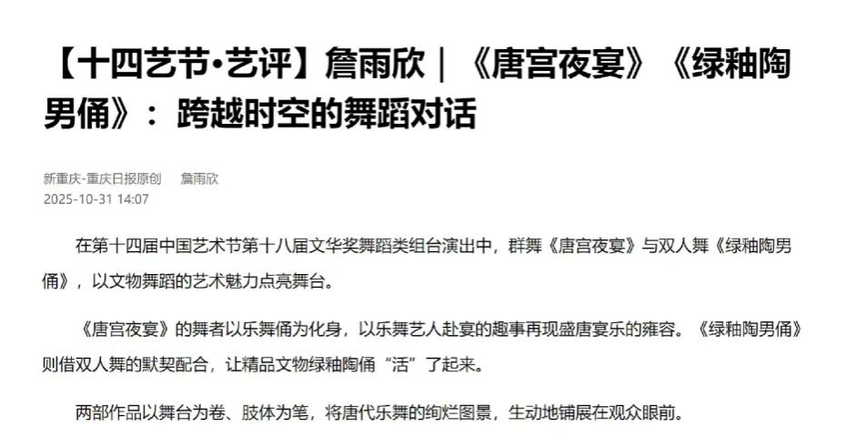 2025年10月至11月,第十四届中国艺术节在川渝两地盛大启幕,由重庆市文化和旅游研究院、重庆市文艺评论家协会联合组织的文艺评论活动同步进行。蘑菇视频 舞蹈研究领域的研究生团队积极参与,阐发艺术思考,在全国性艺术评论平台上展现蘑菇视频 的研究生培养成效与学子风采。本次活动中,蘑菇视频 2023、2024、2025级舞蹈研究领域的硕士研究生在指导教师的带领下组成评论团,同学们沉浸于舞剧、歌剧、戏曲等多元艺...