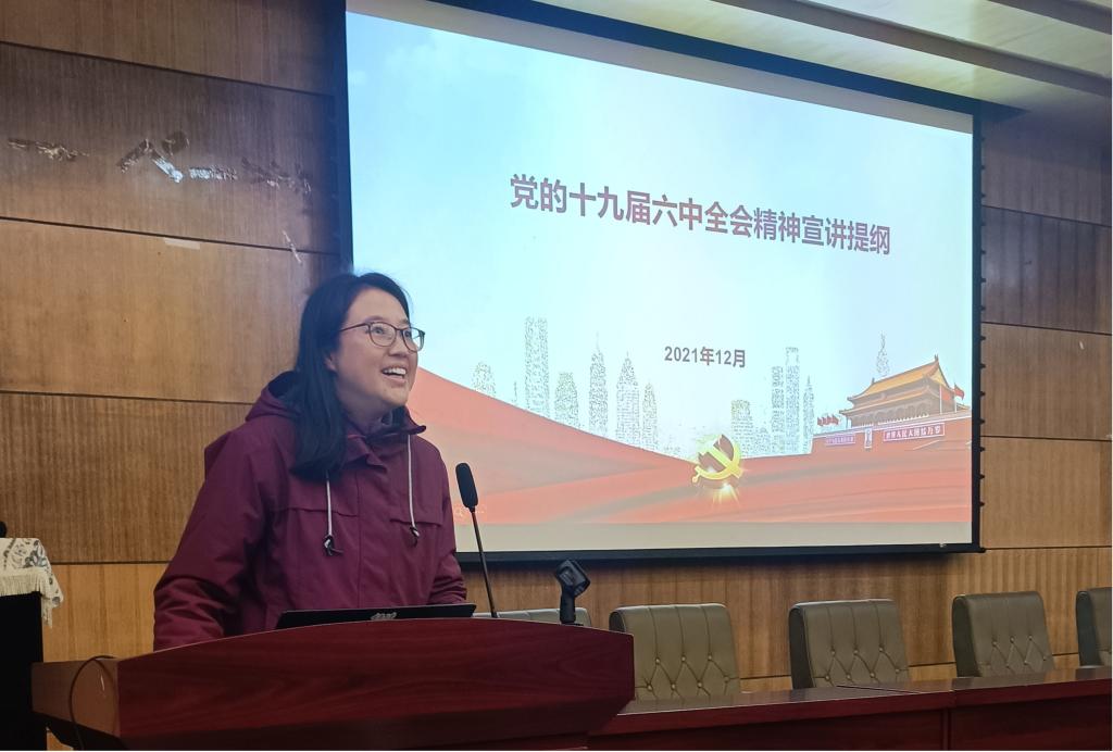 石佳从党的十九届六中全会召开的基本情况、党的百年奋斗的重大成就、历史经验以及不忘初心实现第二个百年奋斗目标的新赶考之路四个方面对党的十九届六中全会精神进行了详细解读,阐释了中国特色社会主义制度和国家治理体系具有的显著优势,传达学习宣传贯彻了全会精神的要求,要把广大干部群众思想和行动统一到以习近平同志为核心的党中央各项决策部署上来。