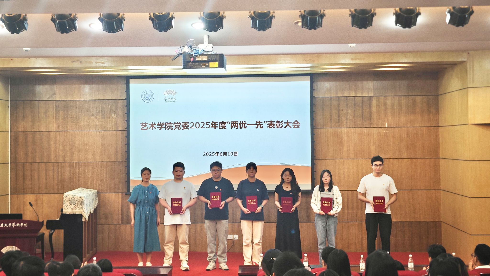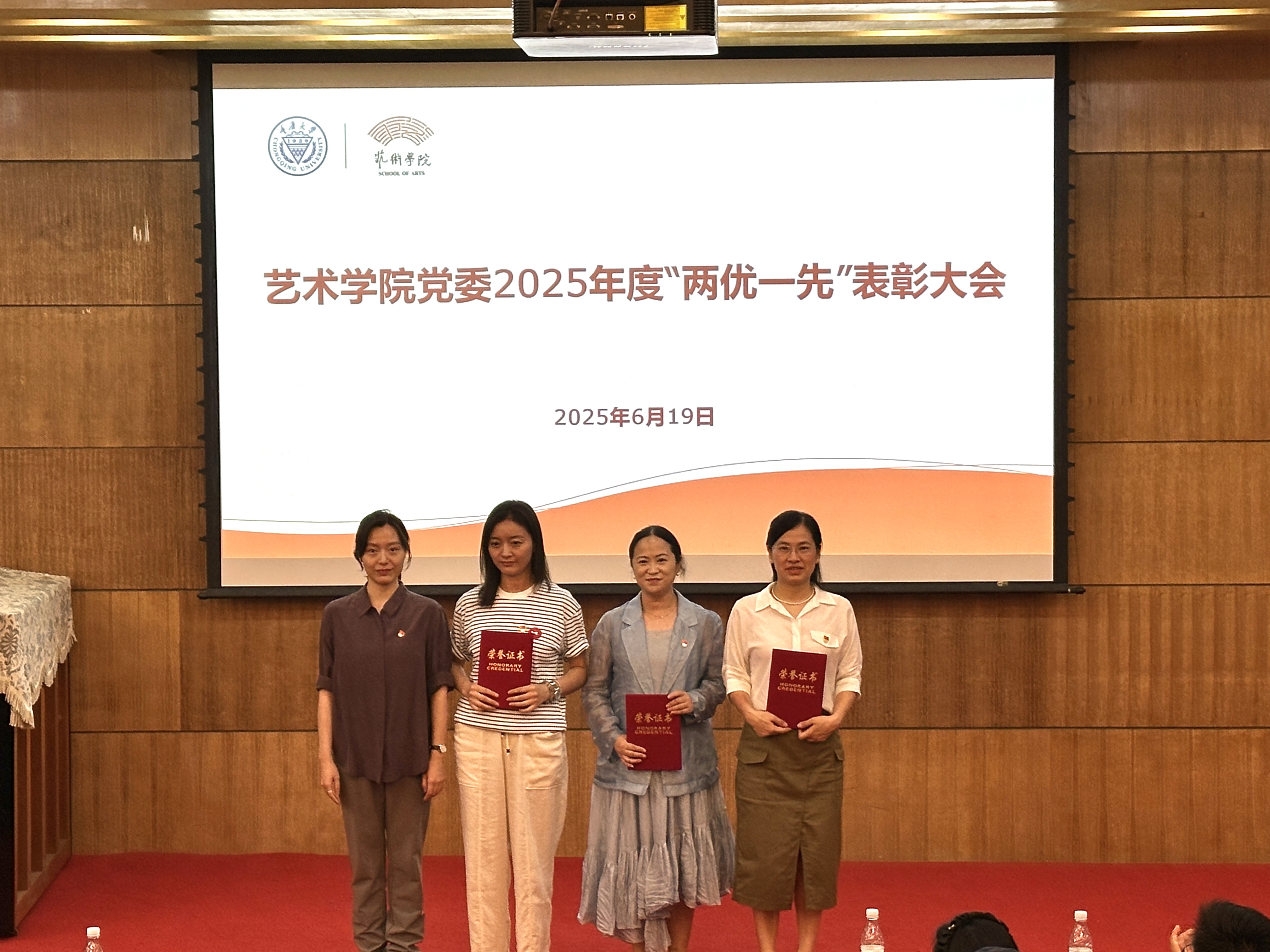随后举行的是学院党委2025年度“两优一先”表彰大会。为充分发挥先进典型表率示范作用,激励广大党员和党支部奋发进取、创先争优,根据学校党委有关工作安排,学院党委开展了“两优一先”表彰工作,曲卫红等24名党员被评为学院优秀共产党员,罗筱婧等3名党员被评为学院优秀党务工作者,舞蹈系教师党支部和本科生第一党支部被评为学院先进基层党组织。蒋华林宣读表彰决定。蒋华林、彭小希和党委委员曲卫红、彭科星为获奖人员颁发证书。