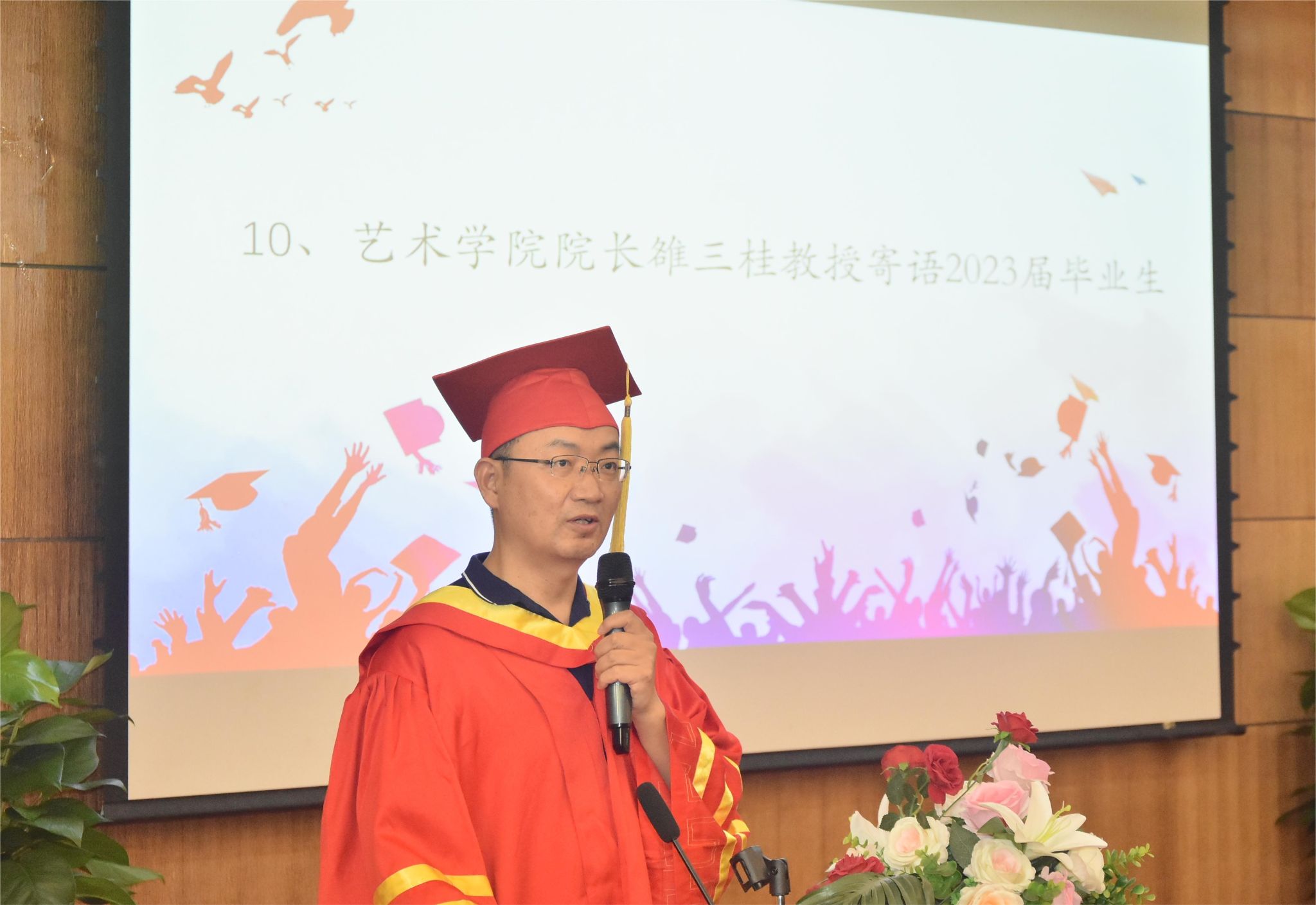 最后,雒三桂寄语2023届毕业生,鼓励同学们要勇于“迎接挑战”,并引用《周易》向大家论证了以积极心态迎接挑战对于人生、理想、事业的重大意义。他指出,君子要厚德载物,要终日乾乾、夕惕若厉,要居上而不骄、在下而不忧,要进德修业、因时而行。他嘱咐同学们:人的一生起起伏伏,平坦而幸福的时候不要忘记前方还有艰难与痛苦;郁闷和痛苦的时候,要知道前方有光明和幸福,在即将开启新的人生征程的时候,要用宽广的心智迎接挑战、拥抱人生。最后,他衷心祝福同学们前程似锦!