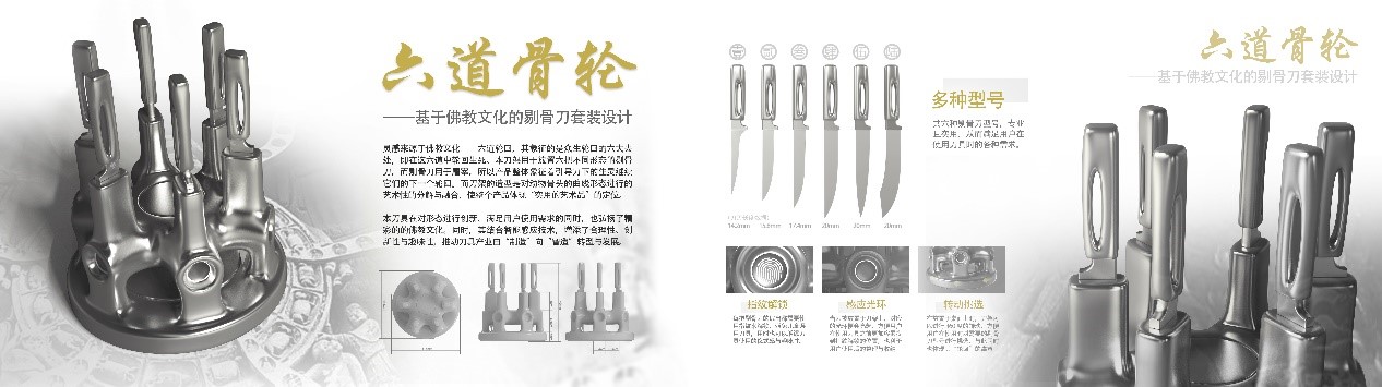 灵感来源于佛教文化——六道轮回,其象征的是众生轮回的六大去处,即在这六道中轮回生死。本刀架用于放置六把不同形态的剔骨刀,而剔骨刀用于屠宰,所以产品整体象征着引导刀下的生灵继续它们的下一个轮回。而刀架的造型是对动物骨头的曲线形态进行的艺术性的分解与融合,使整个产品体现“实用的艺术品”的定位。本刀具在对形态进行创新、满足用户使用需求的同时,也弘扬了精彩的的佛教文化。