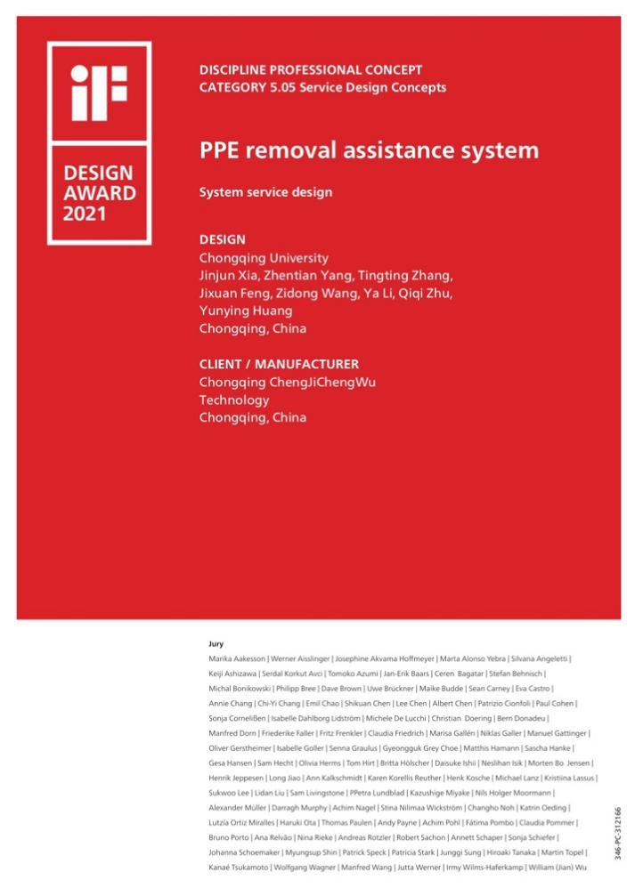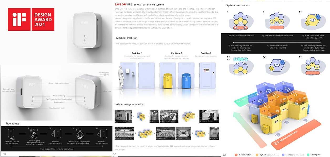 PPE removal assistance system为个人防护装备脱卸辅助服务系统,由工业设计跨学科创新设计团队针对疫情防护展开设计研究,并与陆军军医大学第一附属医院(西南医院)感染科医务团队一起针对疫情中医护人员的工作与PPE防护工作痛点联合开展设计攻关,通过产品设计、交互设计、用户体验设计、服务设计等多种设计形式构建完成了一个完善的服务与使用体系,为医务人员提供保护。团队成员深思疫情时代的医护痛点,用设计解决疫情难题,让『医护——护医』的设计概念给予战斗在疫情一线的天使们以温暖。