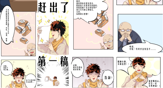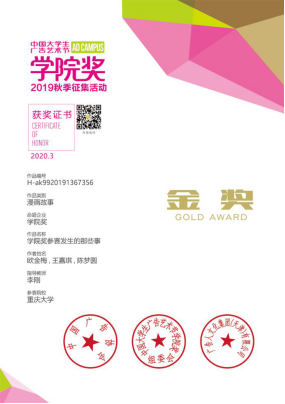 2019级设计学硕士研究生欧金梅和2018级动画本科生王嘉琪、陈梦圆共同所完成的漫画作品——《学院奖参赛发生的那些事》荣获大赛金奖。在李刚老师的指导下,同学们利用课余时间精心创作,反复推敲,多次修改,才最终成稿。该作品以幽默、活泼的画风描绘了师生们参加学院奖的努力及其心路历程,故事诙谐搞笑、情节跌宕转折而不失真实感,容易引发广大参赛学子共鸣,且突出了学院奖本身的魅力与价值,切合命题组要求,最终获得了评委们的一致好评。