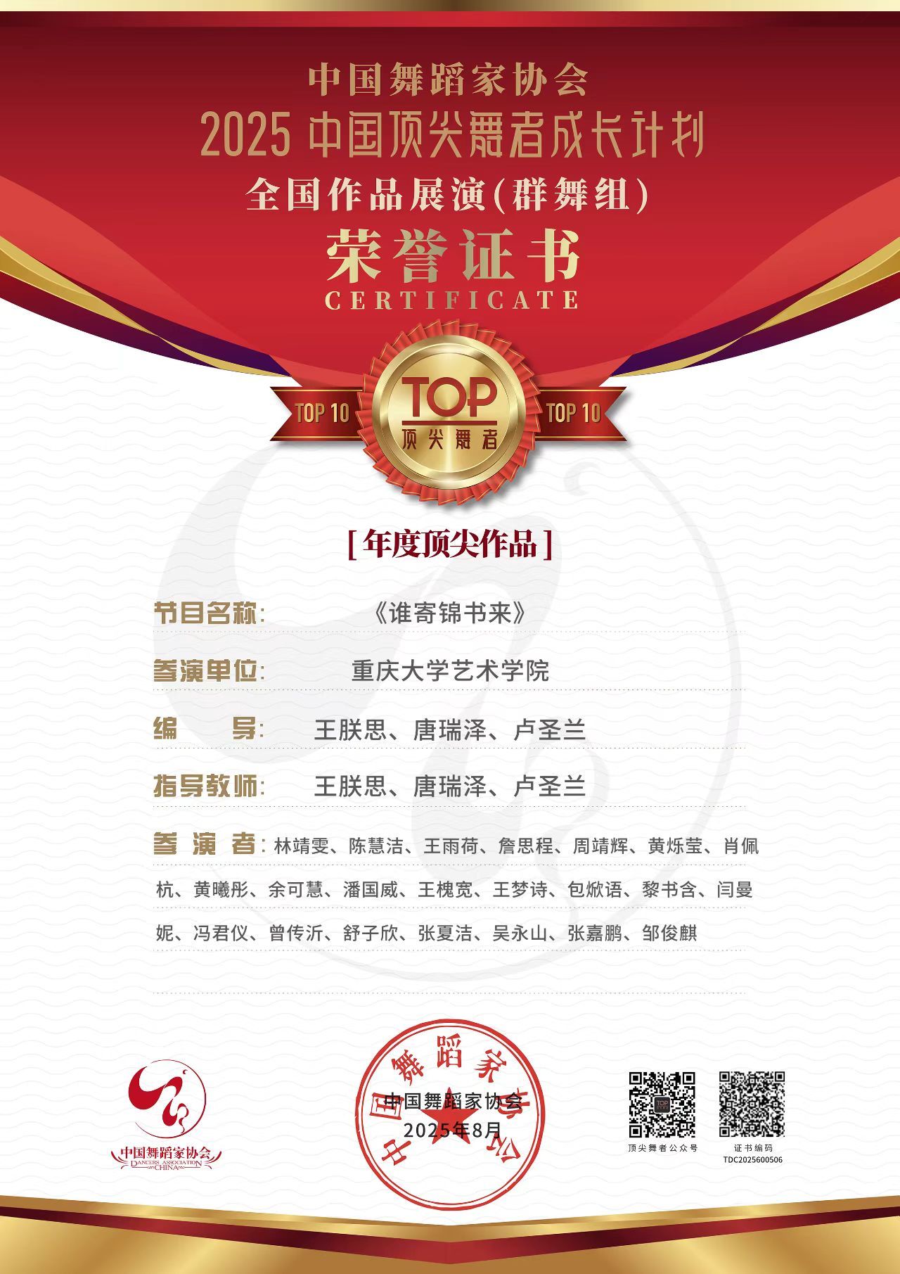 “2025中国顶尖舞者成长计划”全国作品展演(群舞组)由中国舞蹈家协会主办,中共遂宁市委宣传部、中国文联舞蹈艺术中心承办,于2025年8月17日至22日在四川遂宁隆重举行。此次展演作品经过全国13个分区的选拔,汇聚了全国近140部优秀群舞作品与5000余名舞者,展开了为期6天的激烈角逐,最终于12月评选出“年度顶尖作品”“年度优秀作品”和“年度参演作品”三个等级奖项。此前,《谁寄锦书来》《岩魂》两部作品在湖北分区推选“群舞组”比赛中脱颖而出,双双入选全国作品展演。