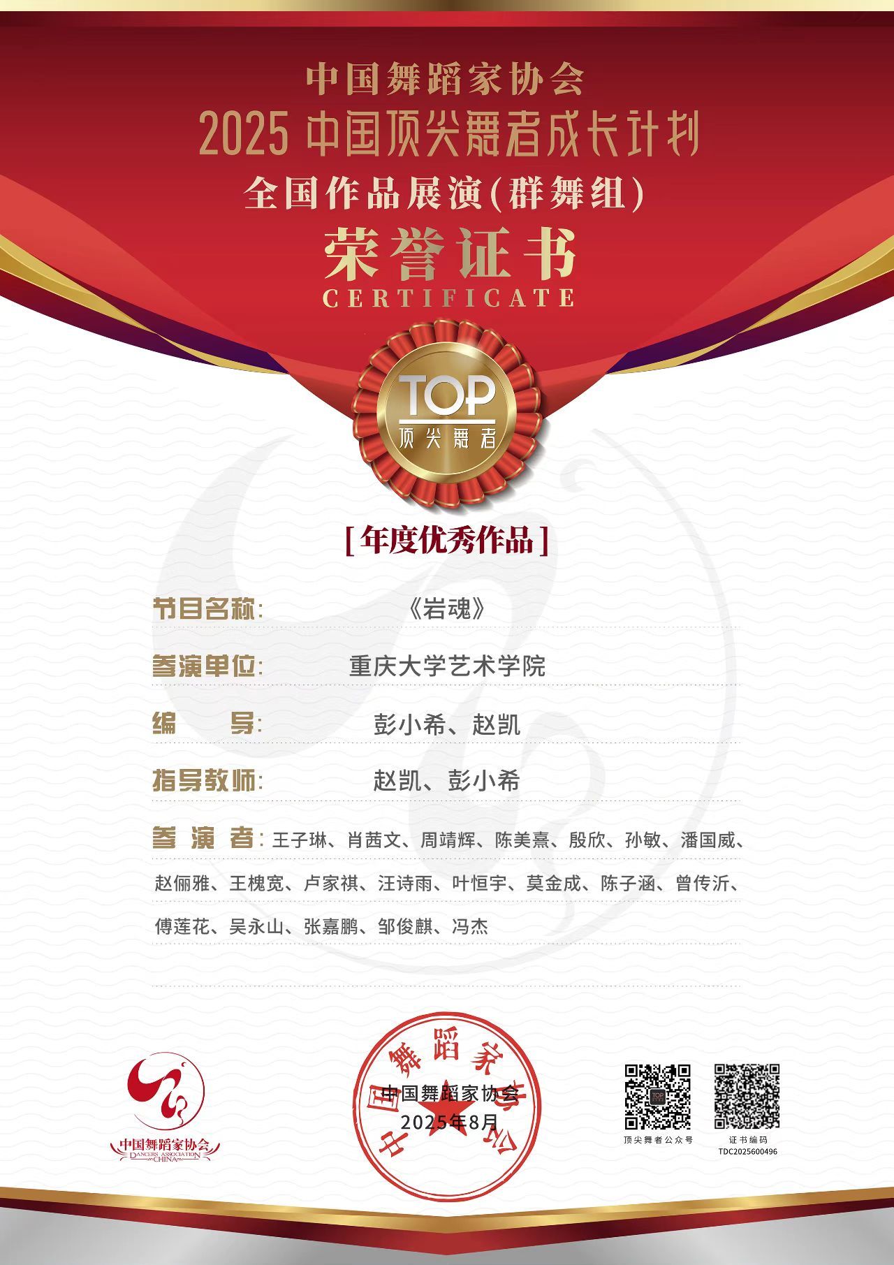 两部舞蹈作品载誉而归,其中《谁寄锦书来》斩获“年度顶尖作品(群舞组)”,《岩魂》荣获“年度优秀作品(群舞组)”。