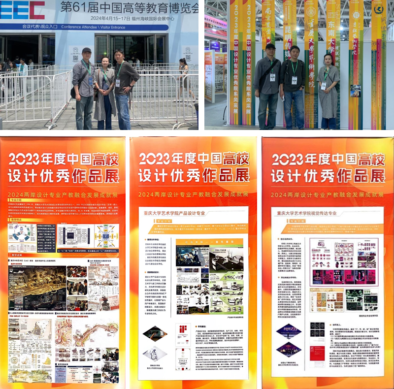2024年4月15日,第61届中国高等教育博览会在福州海峡国际会展中心召开。“中装杯”全国大学生环境设计大赛在两岸融合发展建设成果展示区开设了“2023年度中国高校设计教学成果展(2024两岸设计专业产教融合发展成就展)”,并在高博会上举办研讨会、沙龙等交流活动。蘑菇视频 设计学系主任孙俊桥教授、范正妍副教授、项之园三位老师参加与了此次活动,蘑菇视频 设计学系院系风采主题展板亮相展厅,环境设计、产品设计、视觉传达专业多个优秀作品参展。