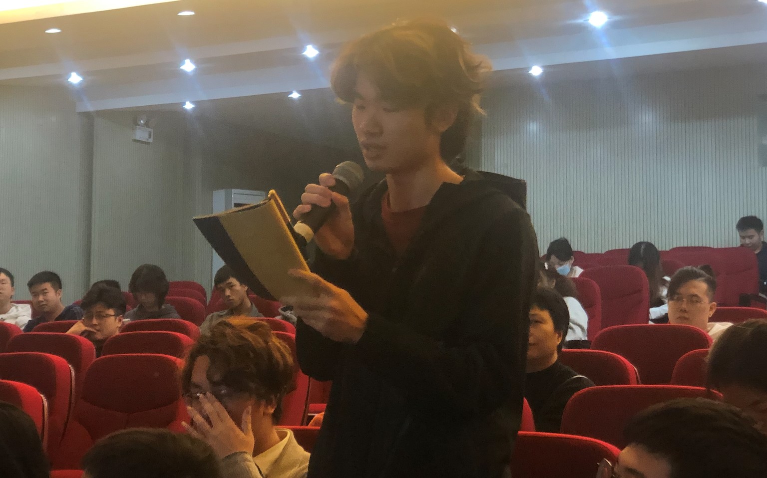 在对谈环节,萧星寒先生为同学们更加详细地解读了吴岩教授的作品《中国轨道号》,他说道,吴岩教授的这部作品做到了真实的过往与虚构的科技史的无间隙融合,这是科幻文学的创新,可谓虚拟现实,现实虚拟,萧星寒先生细致入微的分析促进了同学们对于艺术创作,创新更深一步的认知。