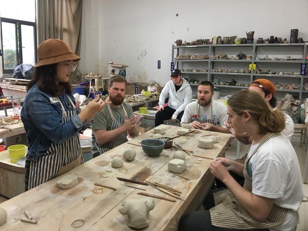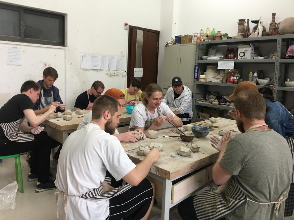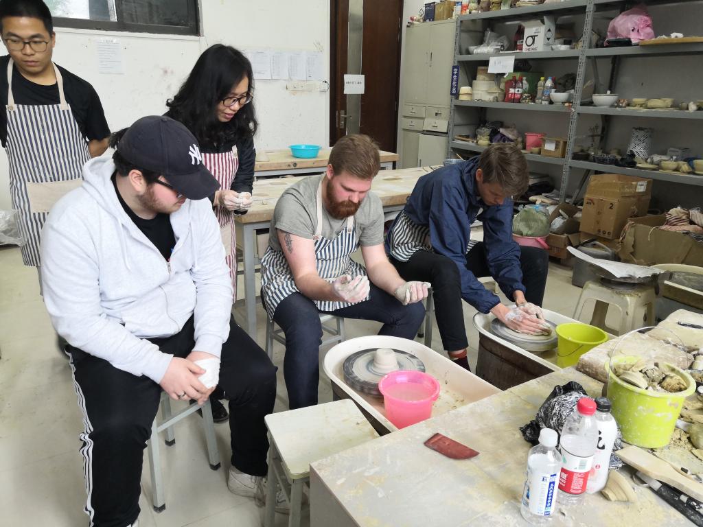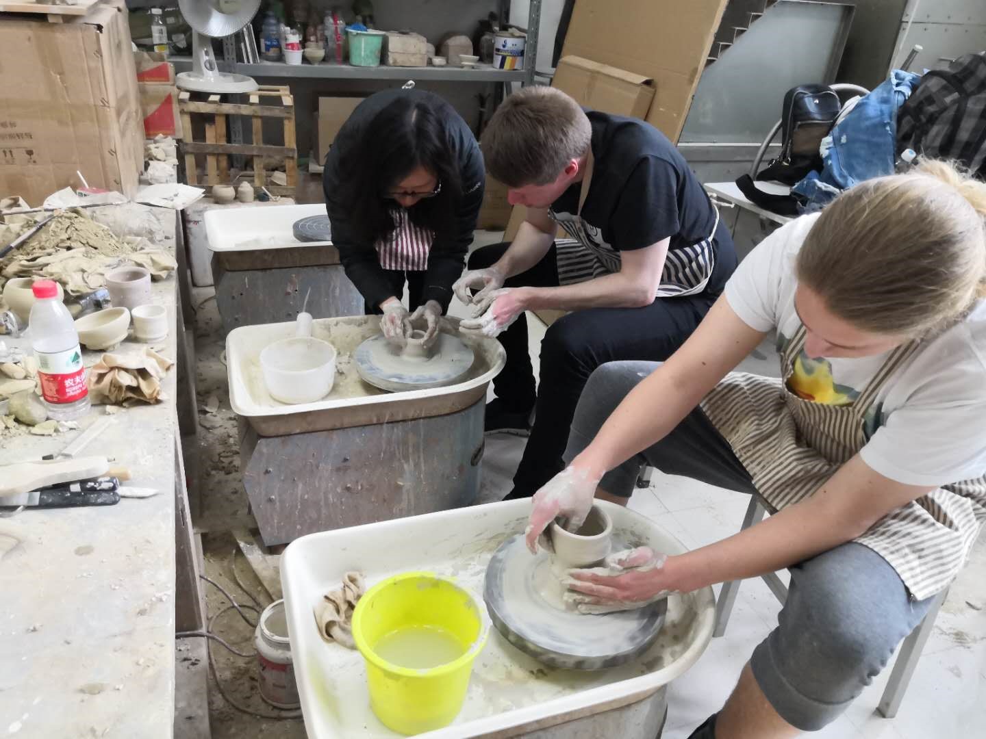 张红霞老师与3位志愿者同学,王丽琴、鲁芝铭和马志丹同学,热情地接待了这些远道而来的客人,带领他们参观了陶艺教室,并开始体验陶艺。这些挪威大学生此前从未做过陶艺,张红霞老师和志愿者同学们耐心地在2个小时的有限时间内教会他们揉泥,制作手捏陶塑作品和拉坯。最后每人都完成了一件手捏陶塑作品猫头鹰的制作,并初步掌握了拉坯的技巧,每人都完成了1-2件拉坯器皿的制作。挪威大学生们都很兴奋,享受与陶泥的亲密接触,体会陶泥在手指间的流动和变化。虽然只有短暂的两个小时,但他们的收获却非常大。一个星期之后,挪威大学生的陶艺作品都上釉烧成了,并被作为来自中国的珍贵礼物带回挪威。此次中外陶艺交流活动圆满成功。