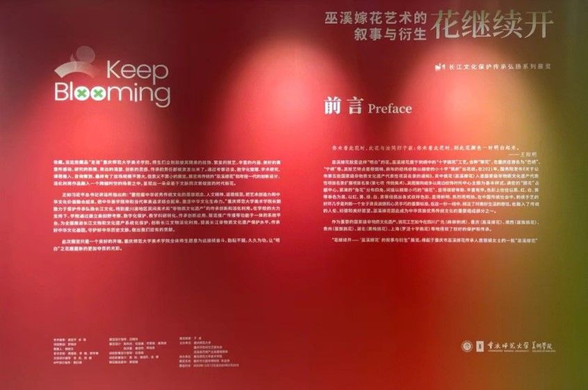巫溪嫁花,属于刺绣中的“十字挑花”工艺,也称“架花”,在重庆又名为“巴绣”“宁绣”等,是国家级非物质文化遗产代表性项目,也是中华民族优秀传统文化的重要组成部分。展览将传统的“巫溪嫁花”和年轻一代的创新设计、活化利用作品融入一个跨越时空的场景之中,呈现出一朵朵基于文脉而次第绽放的时代新花。
