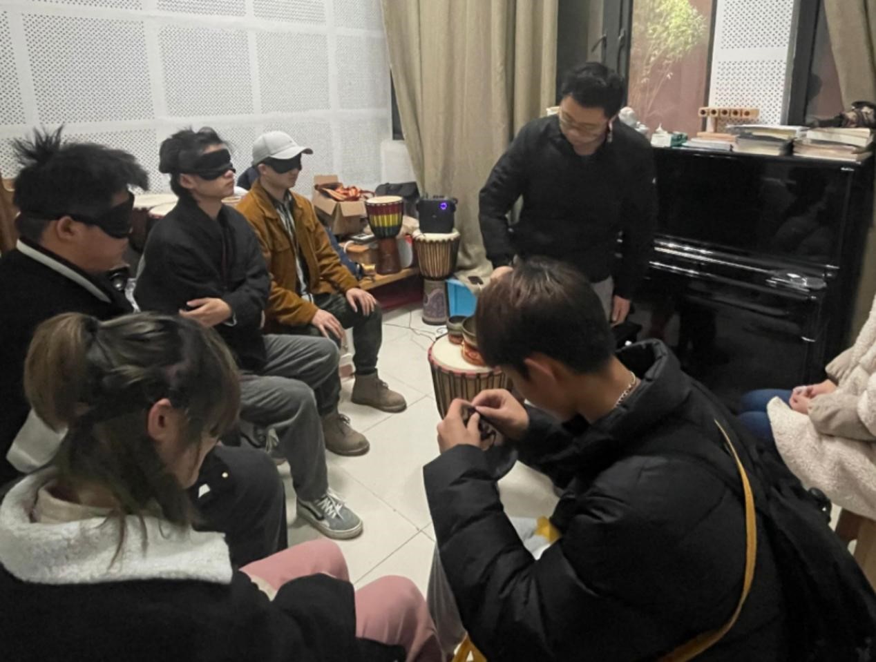 本次训练分为三部分,第一部分是颂钵感受,以舒缓的音乐配合冥想拉开序幕,酝酿情绪,带领大家进入音乐的海洋,感受音符的奇妙。第二部分是注意力培训,通过蒙住眼睛,静心聆听和分辨音乐器材发出的不同音阶,锻炼听觉注意力训练。第三部分是分享交流,在训练的同时让同学们进行乐器演奏和体验分享交流,感受音乐的魅力,体验音乐带来的身心放松,互惠分享心得体会,实现音乐治疗的效果。整个活动过程同学们积极互动,大家感觉充实的内容填满了整个训练时光,身心非常愉悦、放松。