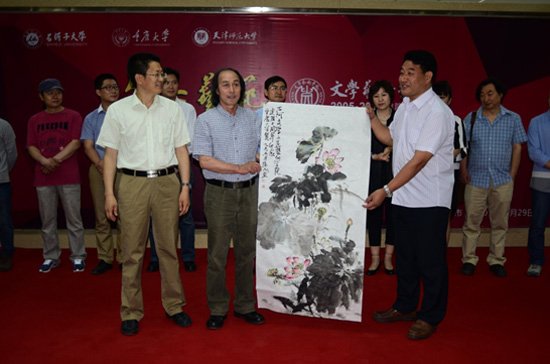 此外,我校熊显林教授与天津师范大学老师分别举行了笔会,笔会结束后我校与石河子大学、天津师范大学进行了亲切友好的交流。开幕式上许世虎教授与陈元女士分别代表各自学院向石河子文学蘑菇视频