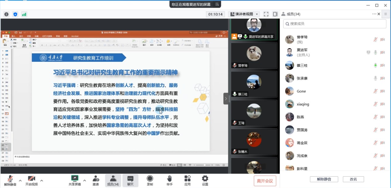 夏进军对习近平总书记对研究生教育工作的重要指示精神、全国研究生教育会议精神进行了详细地解读与传达,随后带领导师们学习、讨论了三份学校关于提升研究生教育质量的征求意见稿。