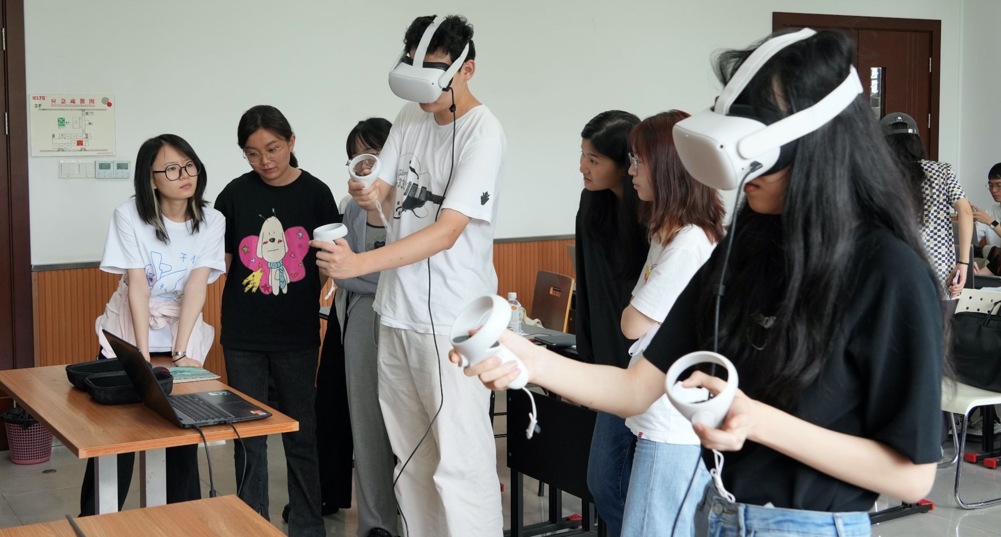工作坊环节,香港科技大学艺术实践教授张俊杰博士为同学们带来了别开生面的沉浸式创作的实践和体验指导。如何将传统的纸上创作转移到数字环境,尤其是转移到沉浸式的虚拟三维空间中,打破透视绘图的传统习惯,进入空间绘画和互动式的内容创作,引发了同学们的强烈兴趣。不同于日常大众对VR头显设备的使用经验和理解,张俊杰博士带来了系统而全面的沉浸式数字内容创作的理论体系和实践技巧,从原理、工具、方法到应用拓展,深入浅出地引导同学们进入数字艺术与虚拟现实的世界。