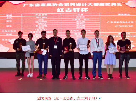 2015级产品设计系王昊杰、刘子瑄同学设计的《“轻阅读”可调节姿势多功能椅》,荣获第十届“华笔奖——红古轩杯”现场唯一一个功能创新奖,并由广东省家具协会会长王克颁发奖杯、证书与一万元奖金。