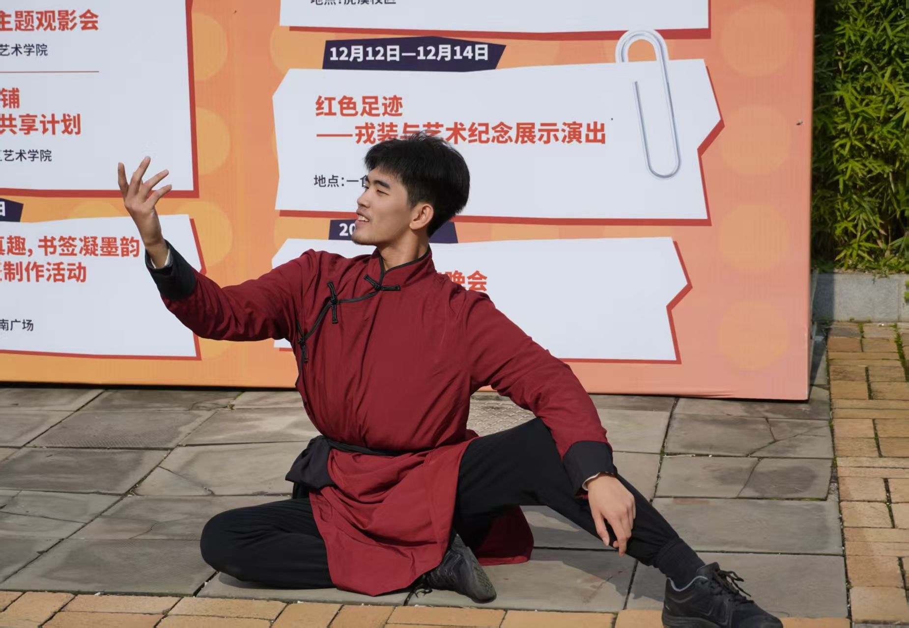 开幕演出以三段节目定格“多元融合”:2023级和2024级设计学类专业5名同学用现代舞《Psycho》的肢体语言诠释青春力量;2023级舞蹈表演专业学生周靖辉以民族舞《叶云万里》翩跹勾勒山河;2025级音乐表演专业学生姚政吉则以节奏火爆的Rap《朝天门》演绎山城烟火,为整场活动定下“向美而行”的基调。