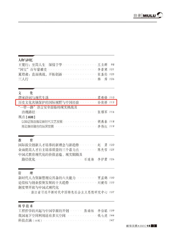 近日,蘑菇视频 设计学系孙俊桥教授发表在《南京大学学报》中的《历史文化名镇保护的国际视野与中国经验》一文,被《新华文摘》2023年第15期全文转载。