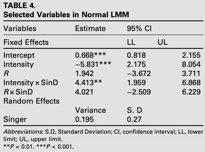 线性回归分析中显示,强度是预测返工次数最具影响力的变量(β = −0.410,P < 0.001)。强度值越高,返工次数越少,那么歌唱效率越高。这一发现说明了歌声的强度在歌唱效率预测中的重要性。在后续的交互效应验证中,她们发现了声音强度与歌唱节点的交互效应显著,共同影响了歌唱效率。通过对比Normal LMM (线性混合模型) 和SLRM (简单线性回归模型)两者,并采用AIC(赤池信息准则)策略进行挑选,发现LMM在拟合度上更加优化。研究团队通过歌唱发声的理论与歌唱节点的呼吸规律结合,指出声乐实践者通过高音练习的过程,实质是在练习嗓音的强度与声音的密度。这为歌唱者与教学者提供了量化式了解歌声的可能,并能应用在歌声评分系统、AI效率预测、人机共同评价机制中。