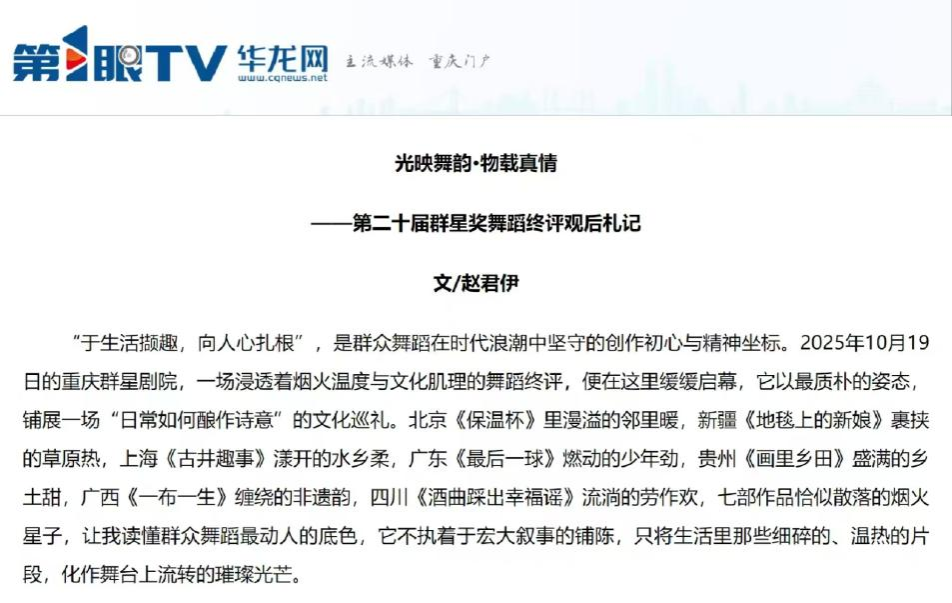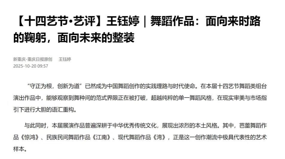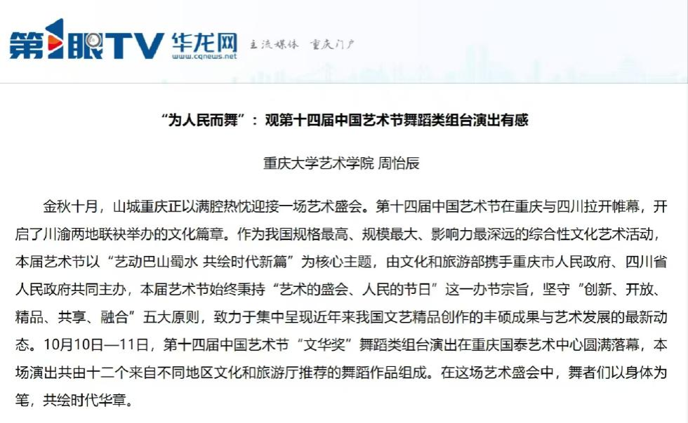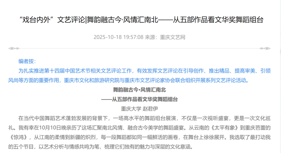 本次活动中,蘑菇视频 2023、2024、2025级舞蹈研究领域的硕士研究生在指导教师的带领下组成评论团,同学们沉浸于舞剧、歌剧、戏曲等多元艺术形式中,并以舞蹈专业的独特视角,聚焦作品的身体叙事、精神内核及文化内涵,由此展开深度思考与多维解读。活动期间,团队累计撰写评论文章11篇,其中6篇稿件经主办方推荐与媒体单位遴选,成功发表于重庆文艺网、第1眼TV-华龙网等重庆主流新媒体平台,其中有2篇文章登上《重庆日报》网络平台。