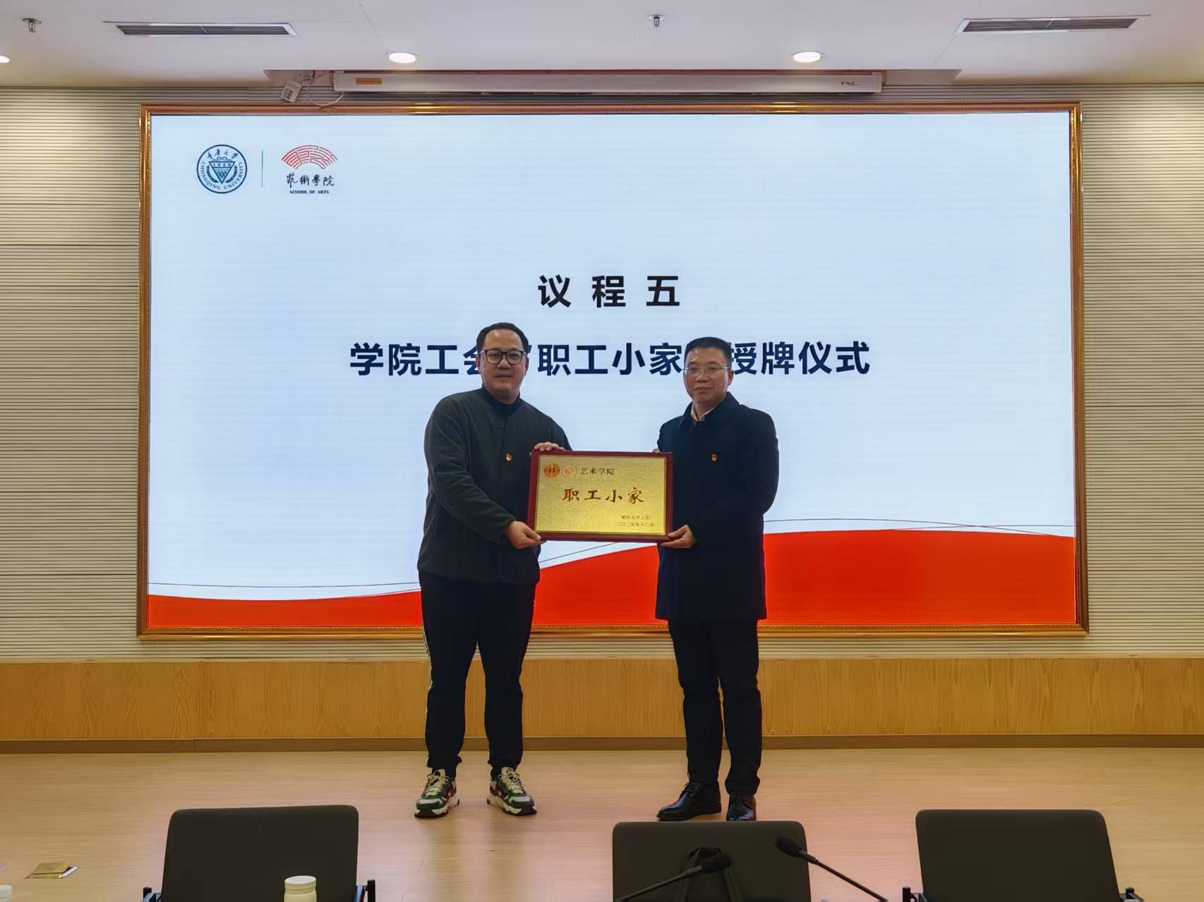 蒋华林向学院分工会转授了校工会“职工小家”牌匾。