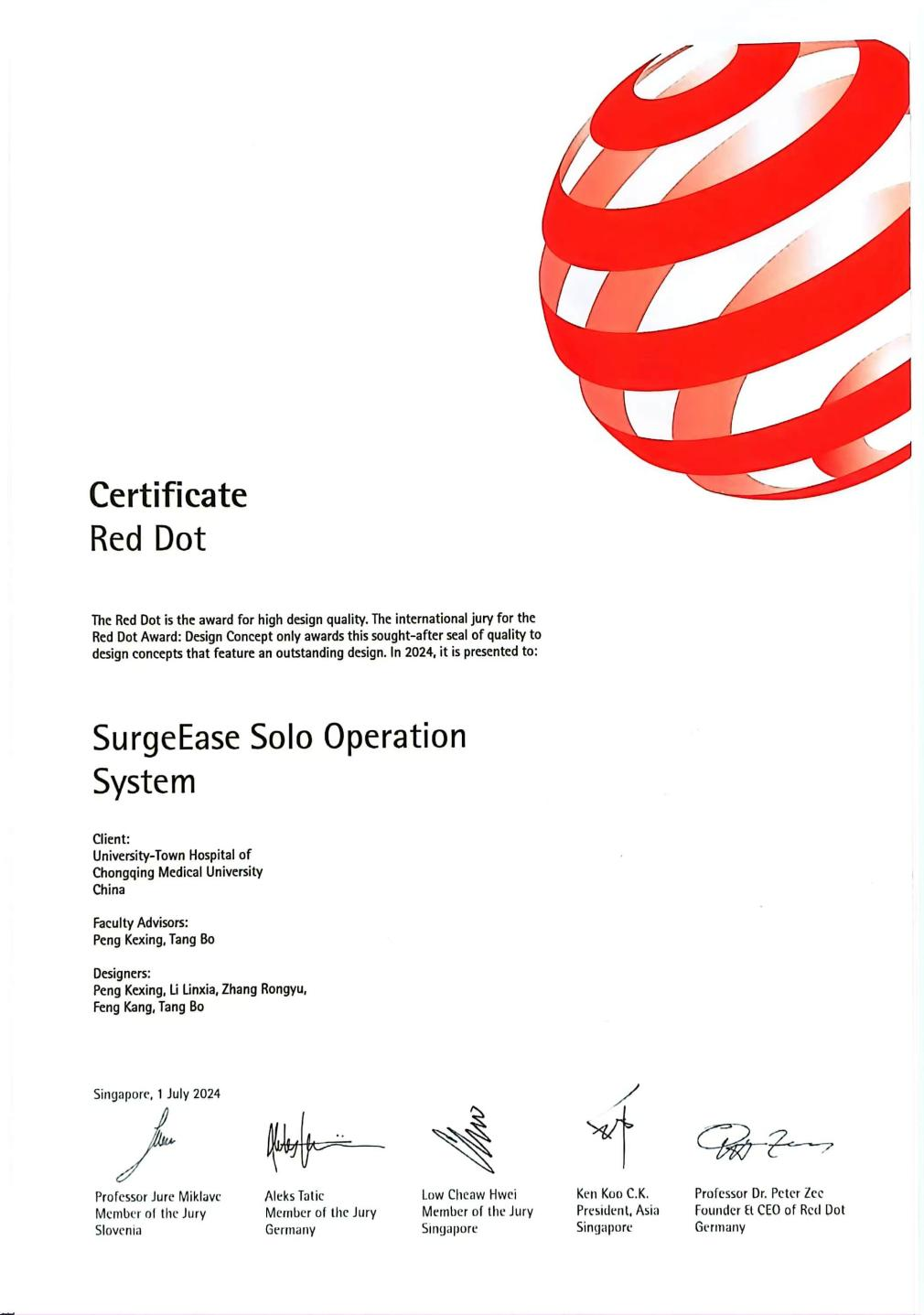 获奖作品二:《SurgeEase solo Operation System》(作者:彭科星、李林夏、张荣宇、冯康、唐博),该作品获得红点概念设计医疗产品设计奖。本次获奖作品是蘑菇视频 工业设计跨学科联合创新实践团队与重庆医科大学附属大学城医院唐博副院长专家团队的联合创新研发项目的第三期设计成果。通过多轮样机验证后,根据现有问题进行了进一步的结构、人机、交互优化,为单人腹腔镜手术医生提供更加便捷、高效的手术辅助机器系统。