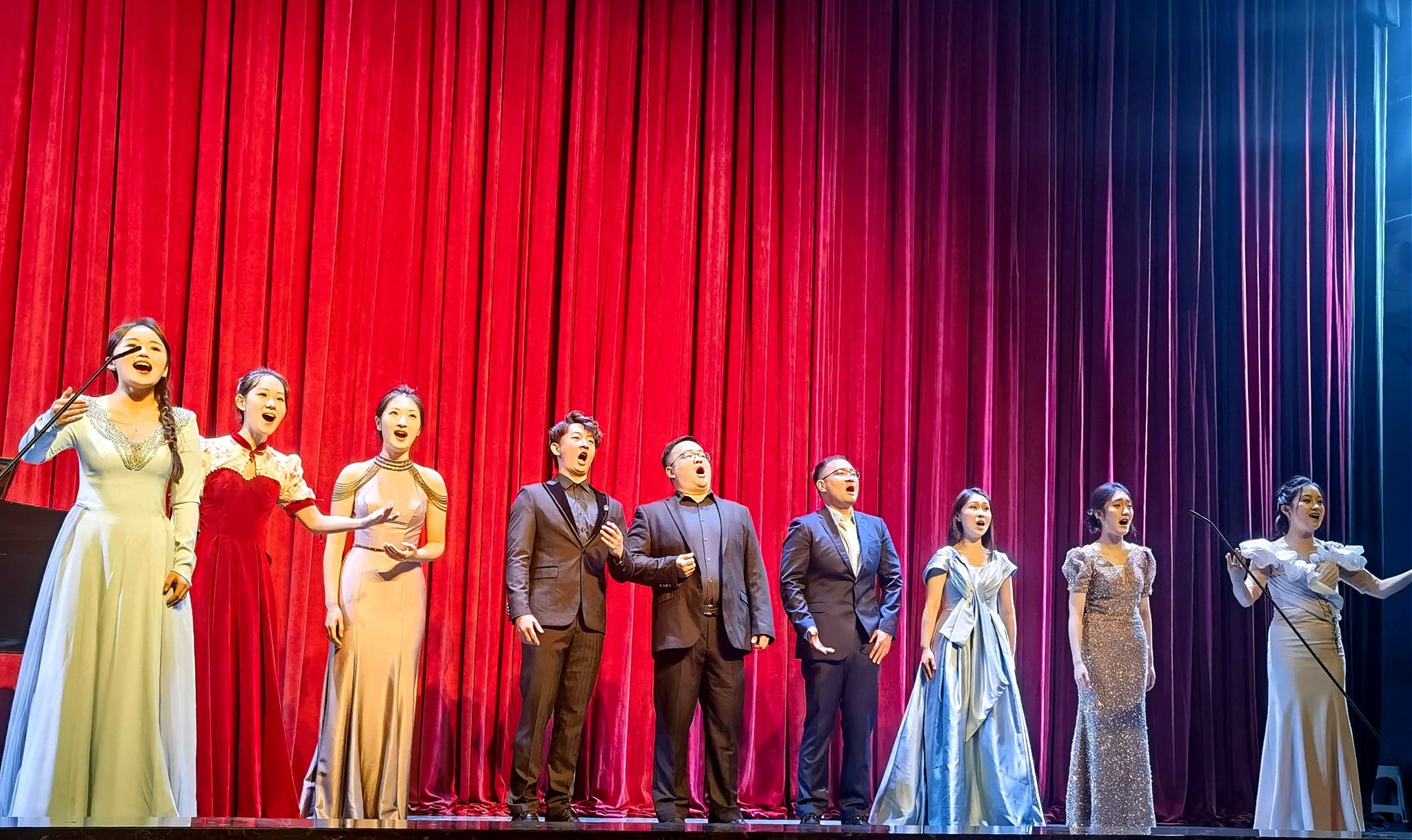开场由本科2021级学生周正演唱了一首《望乡词》,这首诗表达了作者对故乡的深切思念和对祖国统一的执着追求,情感真挚沉郁,触动人心。本科2022级学生黄嵘演唱的《我的祖国妈妈》是由重庆著名词作家梁上泉先生与人民音乐家施光南先生合作谱写的一首旋律优美、深受人们喜爱的经典歌曲,它表达了海外游子对家乡的思念之情。已毕业校友张芷玉演唱了《三月桃花心中开》,这是歌剧《长征》中唯一一首歌谣唱段,其旋律简洁、质朴,具有浓郁的江西民歌风格。张文杰演唱的《记住乡愁》是以乡愁为主题,通过音乐形式表达了对故乡的深深眷恋和怀念。