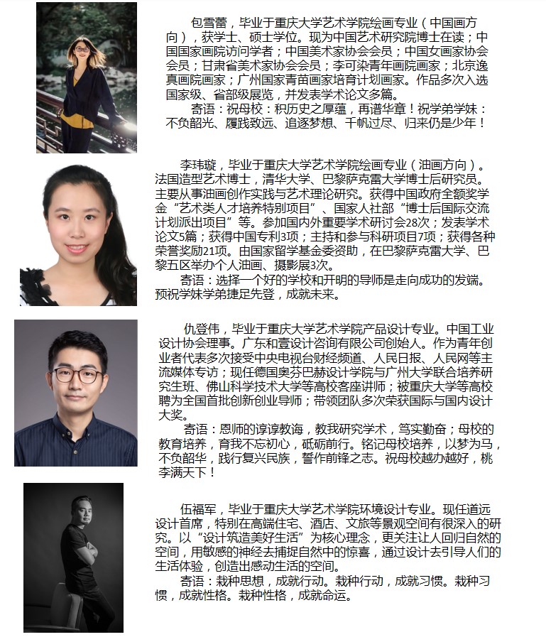 “双一流”顶尖高校的学科优势、良好的办学设施及优美的校园环境,学院已经成为培养美术、设计类高级创作人才和音乐、舞蹈高级表演人才的摇篮。学院师资力量雄厚,拥有一批国内知名专家教授和海外留学归国人员,其中教授、副教授占比达40%。设计学、美术学和新兴交叉学科数字设计与艺术传播为重庆市重点学科。学院本科教学注重突出专业特色,已形成较为完备的美术、设计、音乐、舞蹈专业教学体系,学术氛围活跃,办学成就卓越。