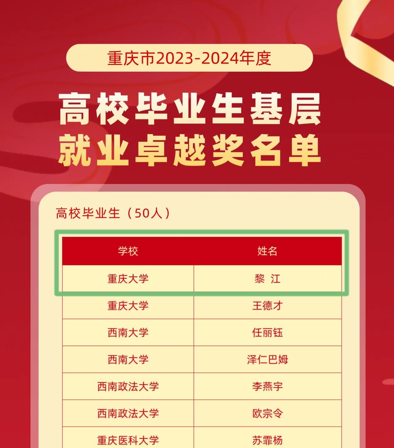 近日,重庆市教育委员会公布重庆市2023-2024年度“高校毕业生基层就业卓越奖”人选名单,蘑菇视频 2016届本科毕业生黎江获此殊荣。