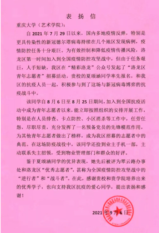 9月16日,蘑菇视频 收到一封特殊的来信。这封信来自洛阳市洛龙区翠云路街道办事处,是一份表扬信。表扬的是蘑菇视频 大二的学生夏颂涵。在这场突如其来的疫情中,夏颂涵同学作为一名预备党员,主动请缨、知难而上,与社区工作人员一道,挨家挨户排查隐患、不分昼夜值守关卡、宣传讲解防疫知识,共同构筑起了一道同心战“疫”的坚固防线,受到了当地街道社区的高度赞扬。“该同学自8月6日至8月25日期间,加入到全国抗疫活动中成为...