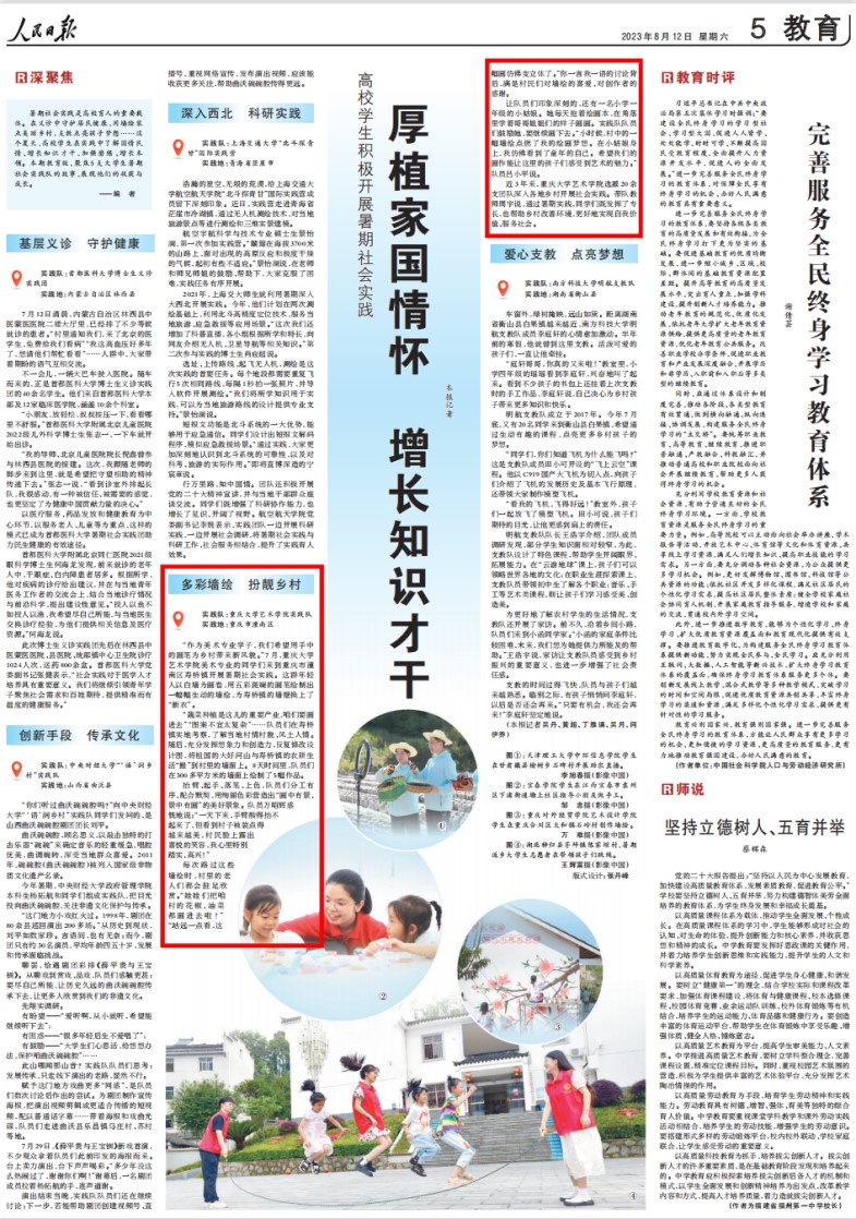 2023年8月12日,《人民日报》教育专栏以《厚植家国情怀 增长知识才干》为题,报道了全国暑期大学生社会实践活动,其中以《多彩墙绘,扮靓乡村》为主题介绍了蘑菇视频 实践队2023年7月16日至7月21日在重庆市潼南区寿桥镇开展的乡村振兴墙绘实践活动。 蘑菇视频 历来重视实践育人工作,教育引导学生在社会实践中厚植家国情怀、了解国情民情、增长知识才干、激发挺膺担当。20...