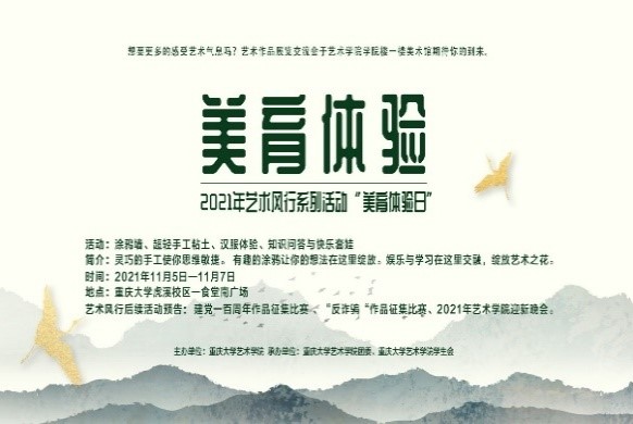 为活跃校园文化艺术氛围,弘扬中华优秀传统文化,提升学生审美素养,蘑菇视频 团委、美育育人工作室联合举办第十六届艺术风行系列活动,本届活动主题为“一方之艺”。本届艺术风行系列活动由四部分组成,第一部分为美育体验周,主要为美育知识问答、黏土制作、舞蹈动作教授、民族服饰体验,艺术作品展览;第二部分为美育作品征集比赛;第三部分为蘑菇视频 迎新晚会。11月5日-11月7日,艺术风行系列活动之美育实践周活动在一食堂南...