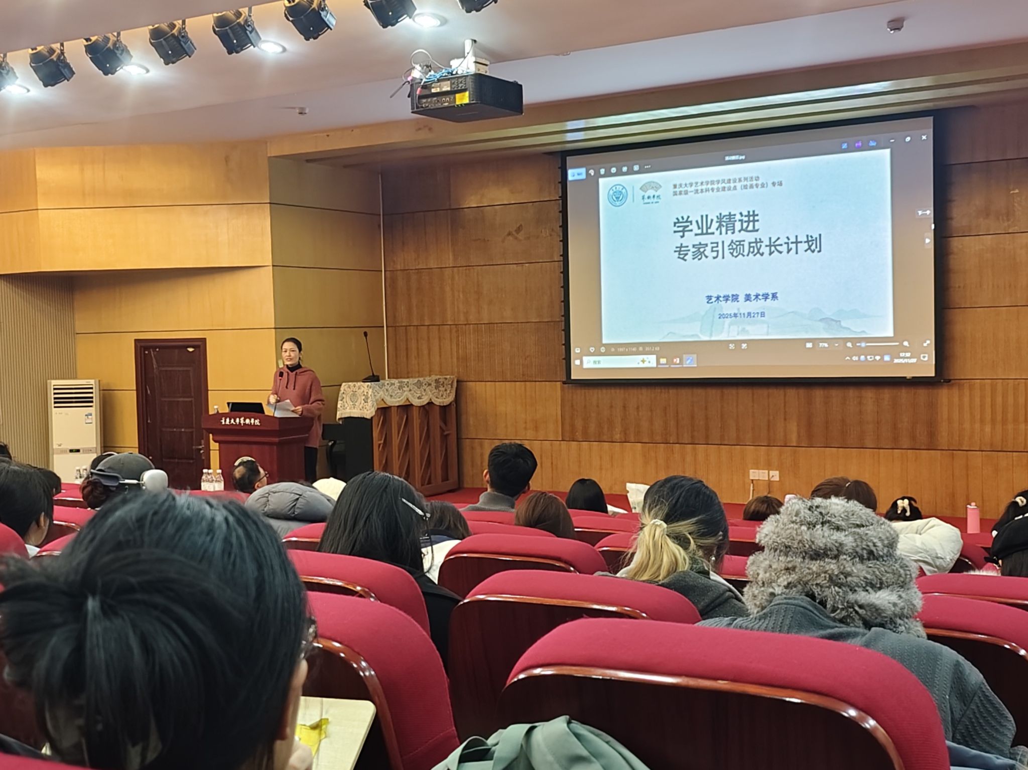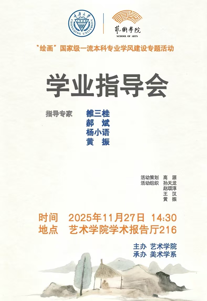 2025年11月27日下午,由蘑菇视频 主办、美术学系承办的“学业精进·专家引领成长计划”学风建设活动在学院学术报告厅顺利举行。本次活动由美术学系副主任高源策划,班主任孙天龙、赵颂淳、王汉、黄振联合组织。蘑菇视频 院长张楠木、美术学系教师及各年级学生参加了此次活动,活动由孙天龙主持。此次活动邀请了美术学系教授雒三桂、美术学系主任武若尘、副主任王汉、副教授郝斌、杨小语以及青年教师代表黄振担任指导专家,...
