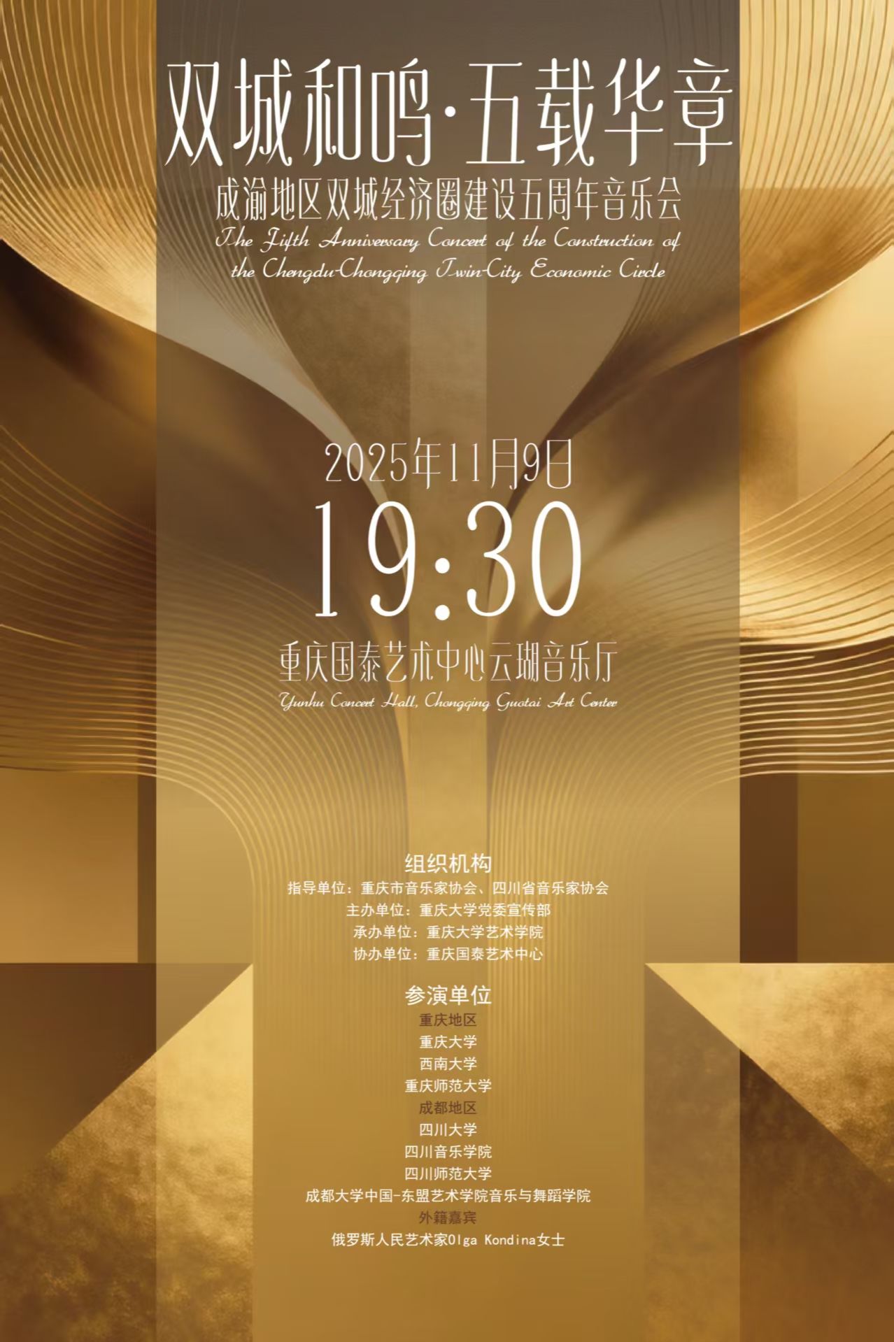 2025年11月9日晚,蘑菇视频 同声2025“双城和鸣·五载华章”成渝地区双城经济圈建设五周年主题音乐会在重庆国泰艺术中心云瑚音乐厅圆满举行。音乐会由蘑菇视频 党委宣传部主办,蘑菇视频 承办,重庆国泰艺术中心协办,并得到重庆市音乐家协会、四川省音乐家协会的指导,以艺术的形式回顾成就、凝聚共识,奏响成渝双城并肩前行的时代强音。音乐会在经典曲目《祝福三峡》的深情旋律中拉开帷幕。整场演出汇聚了独唱、重唱、合...